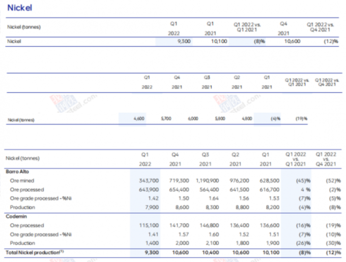 O 21 de abril, o americano Anglo liberou um relatório na produção do níquel no primeiro trimestre. No primeiro trimestre, as áreas de mineração da empresa dois em África do Sul e Brasil produziram um total de 13.900 toneladas. Entre elas, a saída da área de mineração brasileira era 9.300 toneladas, abaixo de 8% ano após ano e de 12% mensal; a saída do sul - a área de mineração africana era 4.600 toneladas, abaixo de 4% ano após ano e de 19% mensal. O alvo da produção do níquel de completo-ano para 2022 sobras inalteradas em 40,000-42,000 toneladas.
